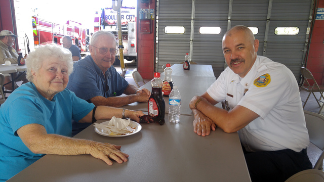 Dorothy and Jack Rants chat with Division Chief of Operations Chuck Gebhart about the great people at the fire department and the Rants’ 82 years in Boulder City during the Boulder City Fire Department’s annual pancake breakfast Saturday.