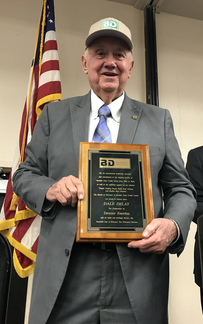 Dale Imlay shows off his new Boulder Dam Credit Union baseball cap and plaque denoting his new status as the first director emeritus for the financial institution during its annual membership meeting and dinner Wednesday, Feb. 20, 2019. Imlay has volunteered with and served on the board at the credit union from 1962-2019.