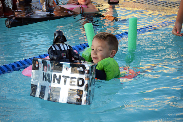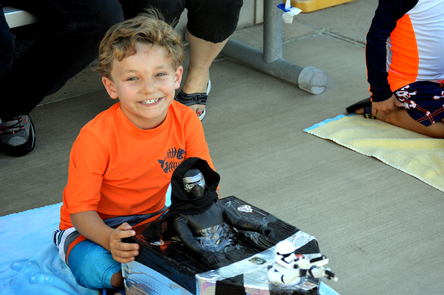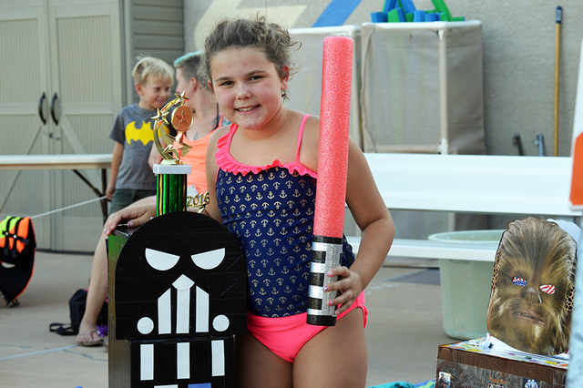 Cash Arioste, 5, shows off his Imperial boat with Kylo Ren as the pilot. Cash’s boat made it safely across the pool during the 16th annual Cardboard Boat Race at the city’s municipal pool. Max Lancaster/Boulder City Review