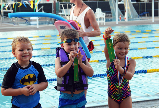 Five-year-olds, from left, Lee Sheldon, Drew Huysentruyt and Taylor Reeves show off their medals after racing their boats during the Boulder City Parks and Recreation Departments 16th annual Cardboard Boat Race at the city’s pool July 20. Taylor won first place in her heat while Drew placed second, and Lee placed third. Drew also won the first-place award for best Imperial boat. Max Lancaster/Boulder City Review