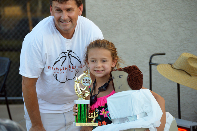 Mekenzie Martorano, 7, is presented the third-place trophy for best Rebel boat by Mayor Rod Woodbury during the parks and recreation department’s 16th annual Cardboard Boat Race on July 20. Mekenzie said winning the award was cool because she doesn’t get awards often. Max Lancaster/Boulder City Review