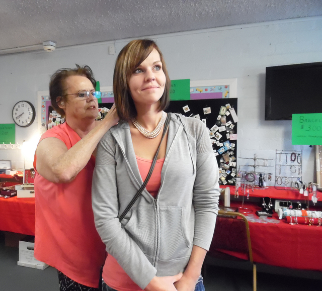 Beverly Muilenburg, left, helps Kym Behnke try on a pearl necklace during Grace Community Church’s 69th annual Country Store on Friday.