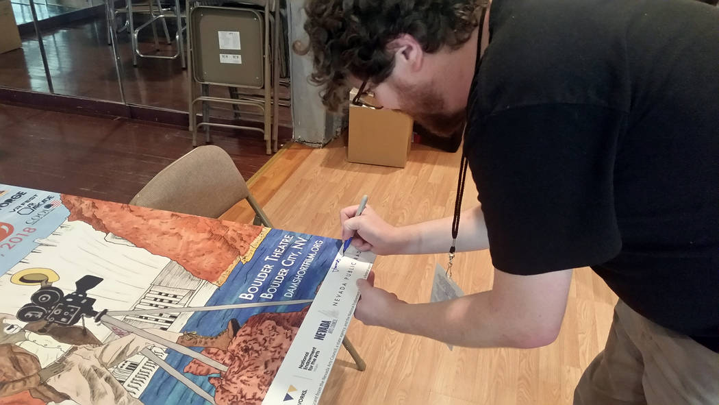 Local resident and artist James Howard Adams signs the poster he designed for the 14th annual Dam Short Film Festival.