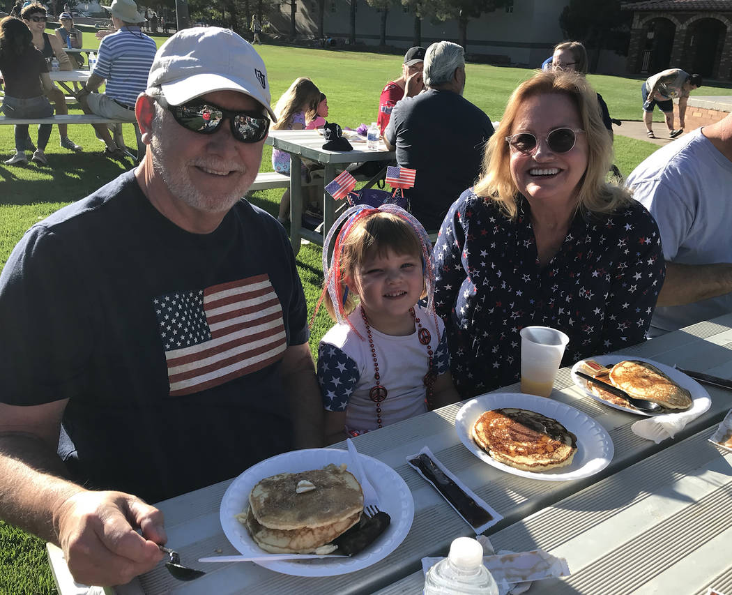Enjoying a pancake breakfast presented by the Rotary Club of Boulder City in Bicentennial Park that kicked off the Damboree celebration July 4, 2019, were, from left, Harry Fullmer, Hazel Lanning, 4, and Susan Fullmer, all of Boulder City.