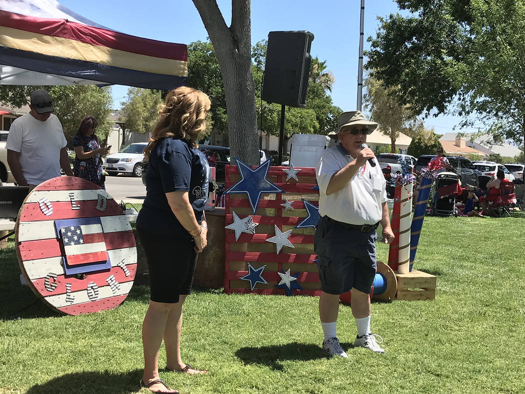Mayor Kiernan McManus welcomes locals and visitors to the Damboree festivities in Broadbent Park on July 4 as Jill Rowland-Lagan of the Boulder City Chamber of Commerce looks on.