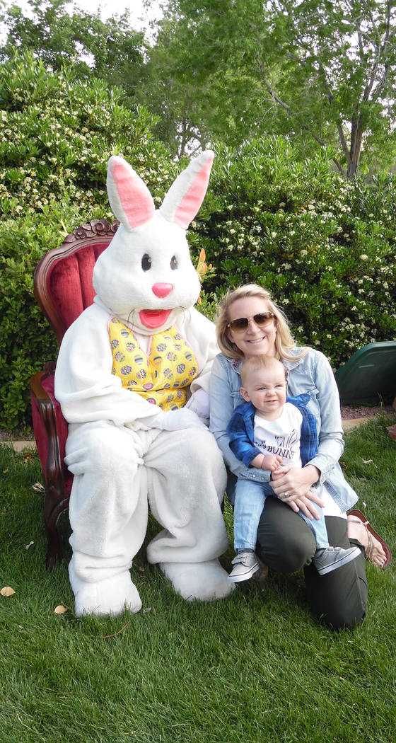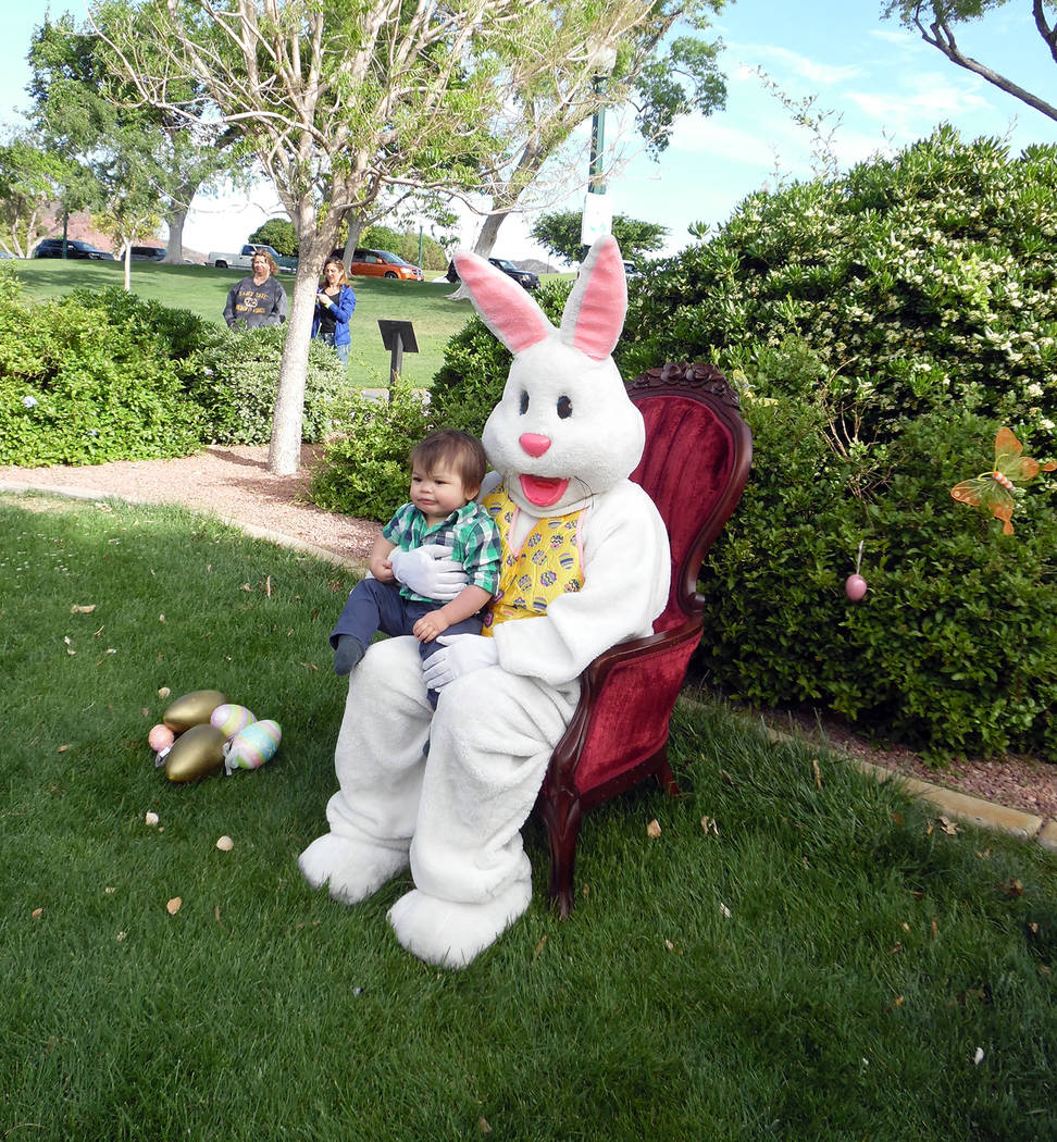 Oliver Gossard, 1, of Boulder City wasn’t quite sure what to make of the Easter bunny as his family snapped pictures of him during Saturday’s annual Easter egg hunt in Wilbur Square Park.