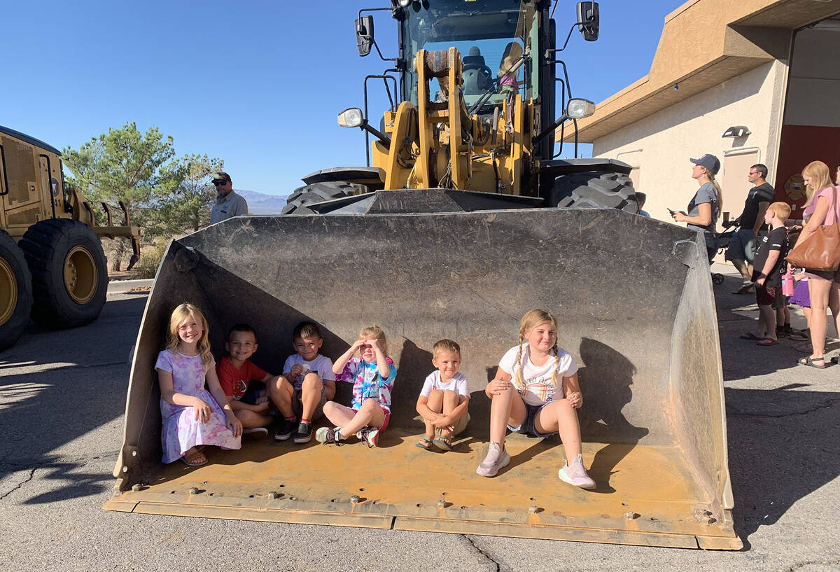 Getting an unusual view of the city’s equipment used to move dirt during Boulder City Fire Department’s annual open house and pancake breakfast Saturday were, from left, Lyla Leventry, Zayden Grant, Edward Grant, McKenna Leventry, Logan Grant and Olivia Zimkus. ▶ See more photos from the event on Page 2.