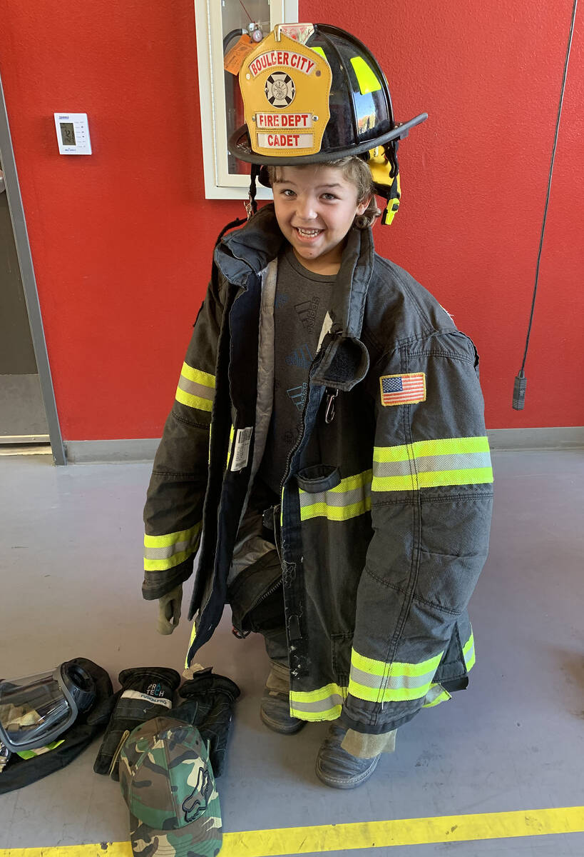 Sawyer Willard, 7, of Boulder City tries on firefighters’ equipment during the Boulder City Firefighter’s Association’s annual pancake breakfast and open house Saturday, Oct. 8. His father is a firefighter in Henderson.