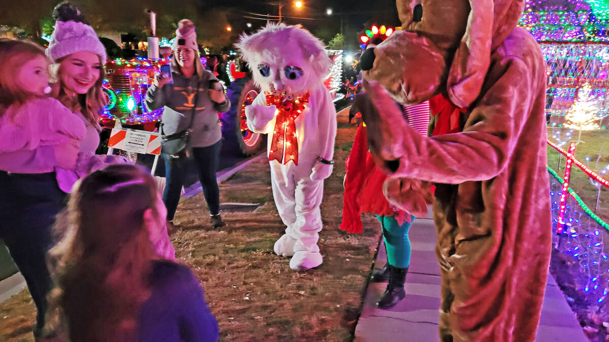 Jingle Cat and Hoover help turn on the lights at The Christmas House, 1525 Fifth St., on Friday in Boulder City.