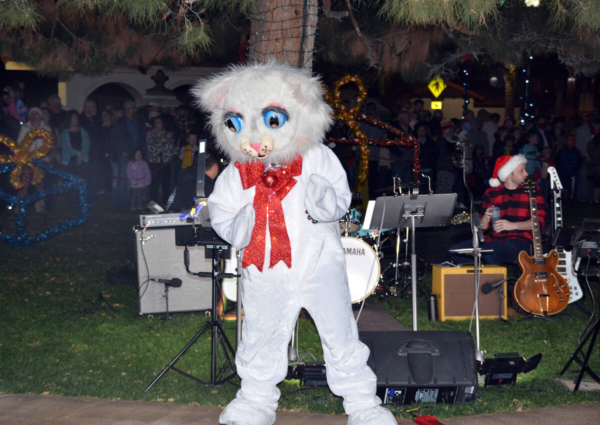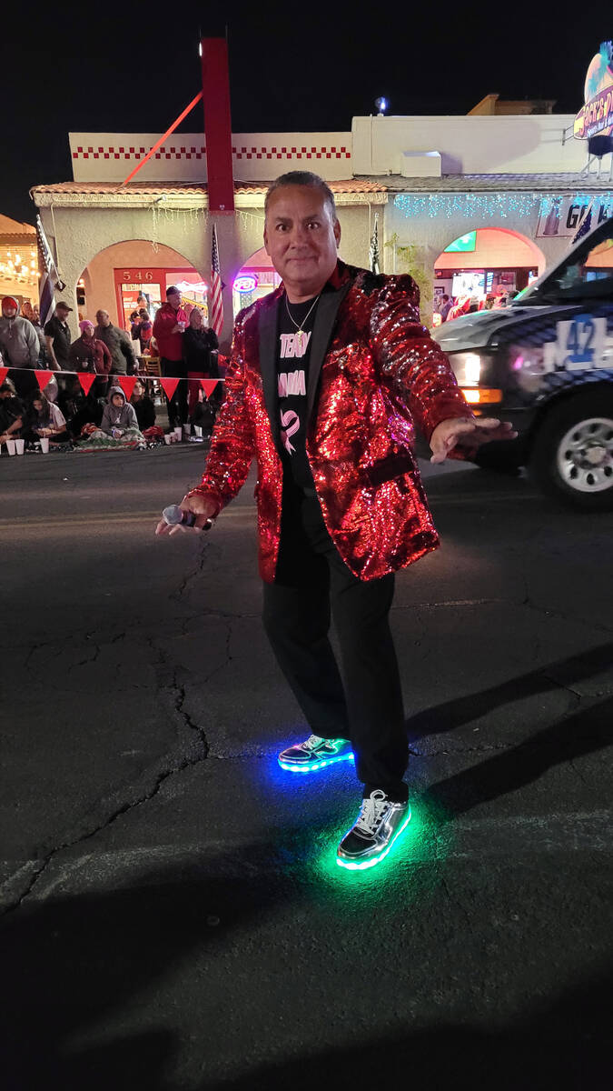 Mike Pacini emcees Santa’s Electric Night Parade while wearing his special shoes Saturday in downtown Boulder City.
