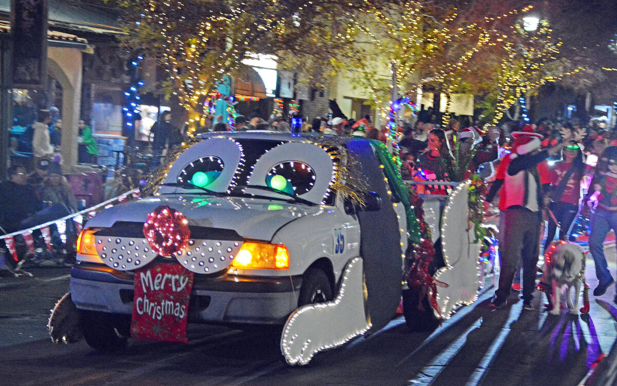 Local nonprofit organization See Spot Run created a float, right, that looked like a dog for Santa’s Electric Night Parade on Saturday in Boulder City.