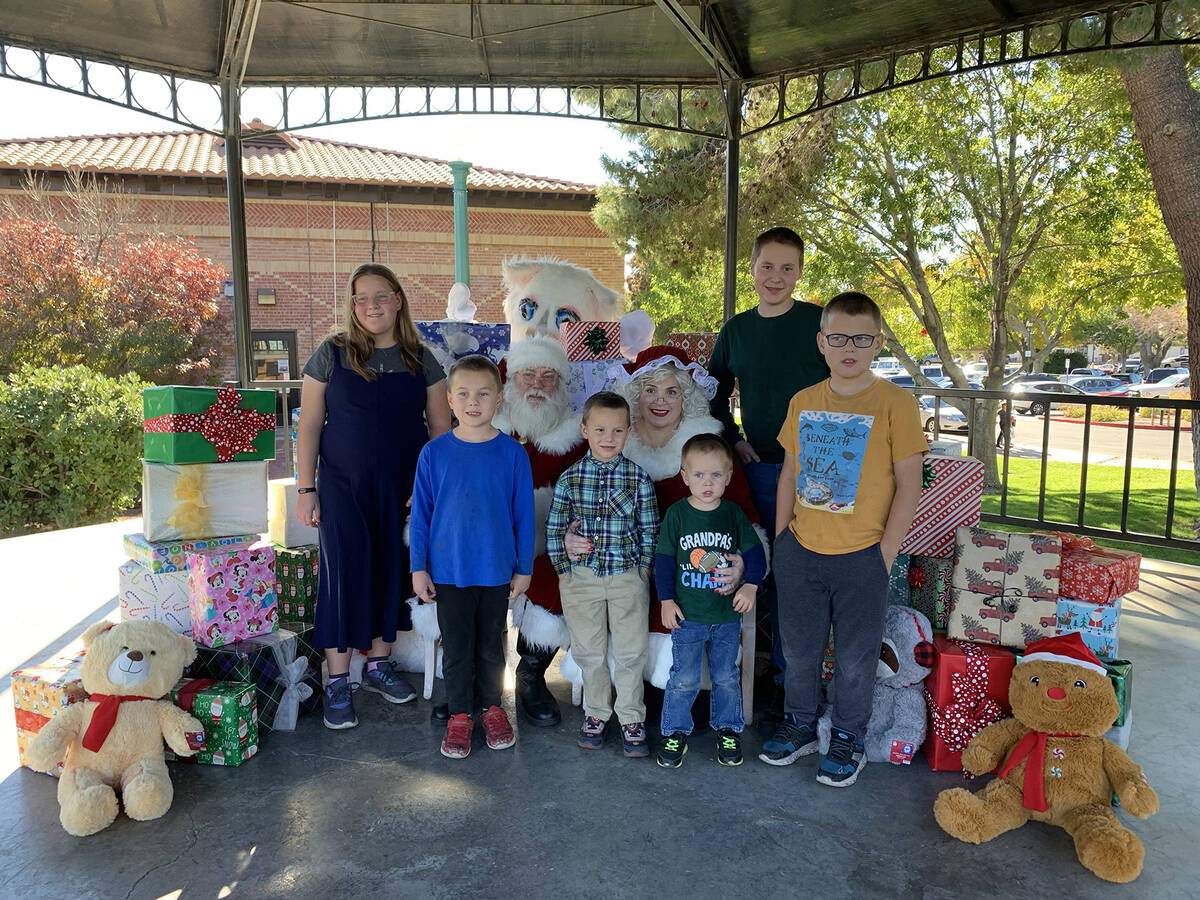 Members of the Segedy family of Boulder City, from left, Courtney, Joseph, James, John, Jerry and Jeffery came to visit Santa and Mrs. Claus and Jingle Cat at Santa’s Picture Party presented by the Boulder City Chamber of Commerce on Saturday.