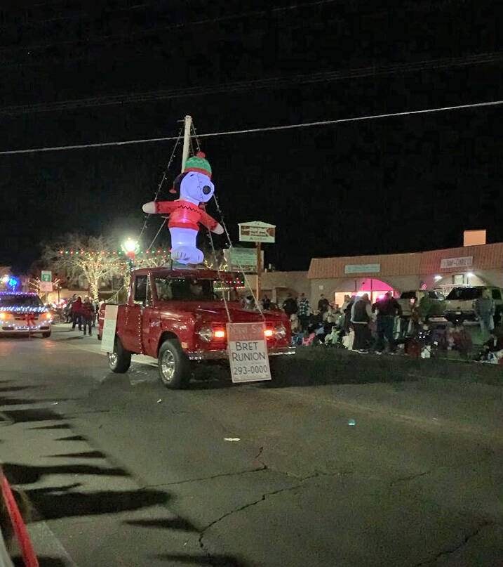 Snoopy rides atop a vehicle as it travels down Nevada Way in downtown Boulder City on Saturday during Santa’s Electric Night Parade. It was part of an entry sponsored by Desert Sun Realty and Bret Runion.
