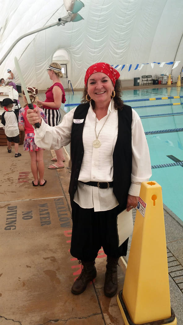 Boulder City Aquatic Coordinator Cheree Brennan shows off her sword-wielding skills Saturday, Nov. 3, at the pool’s pirate party.