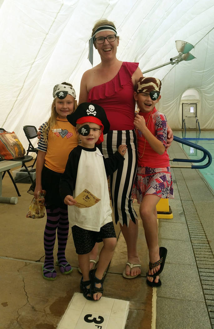 The Cook family, from left, Hailey, Lara, Harmony and Parker, in front, came to the pirate party at the Boulder City pool Saturday, Nov. 3, in their best pirate attire.