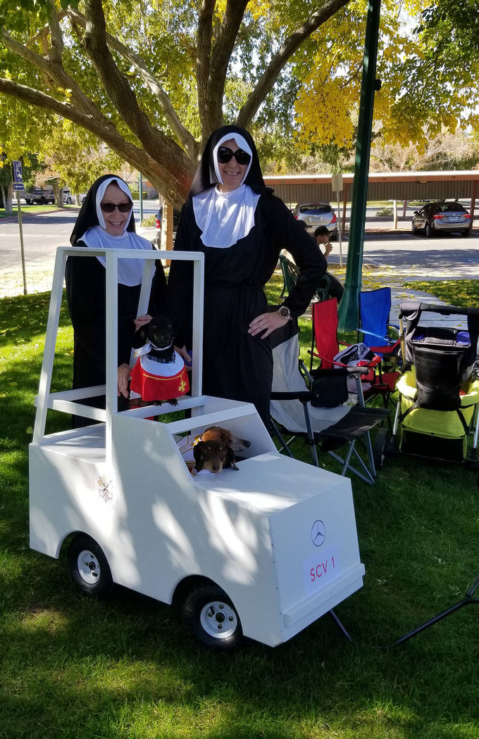 Eva Fischer, left, helps her friend Caireen Ulepic with the wienie pope mobile at the Boulder City Chamber of Commerce’s 2019 Pooch Parade on Saturday, Nov. 16, at Bicentennial Park. Two of Ulepic’s dogs, in front from left, Liam and Otto, were cardinals; her dog Max, in back, was the pope.