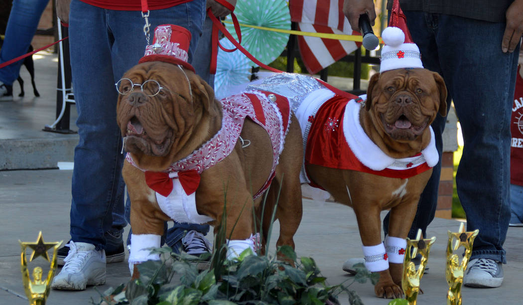 French mastiffs Mick Baudoux, left, and Gigi Baudoux show off their holiday costumes at the Boulder City Chamber of Commerce’s 2019 Pooch Parade on Saturday, Nov. 16, at Bicentennial Park.