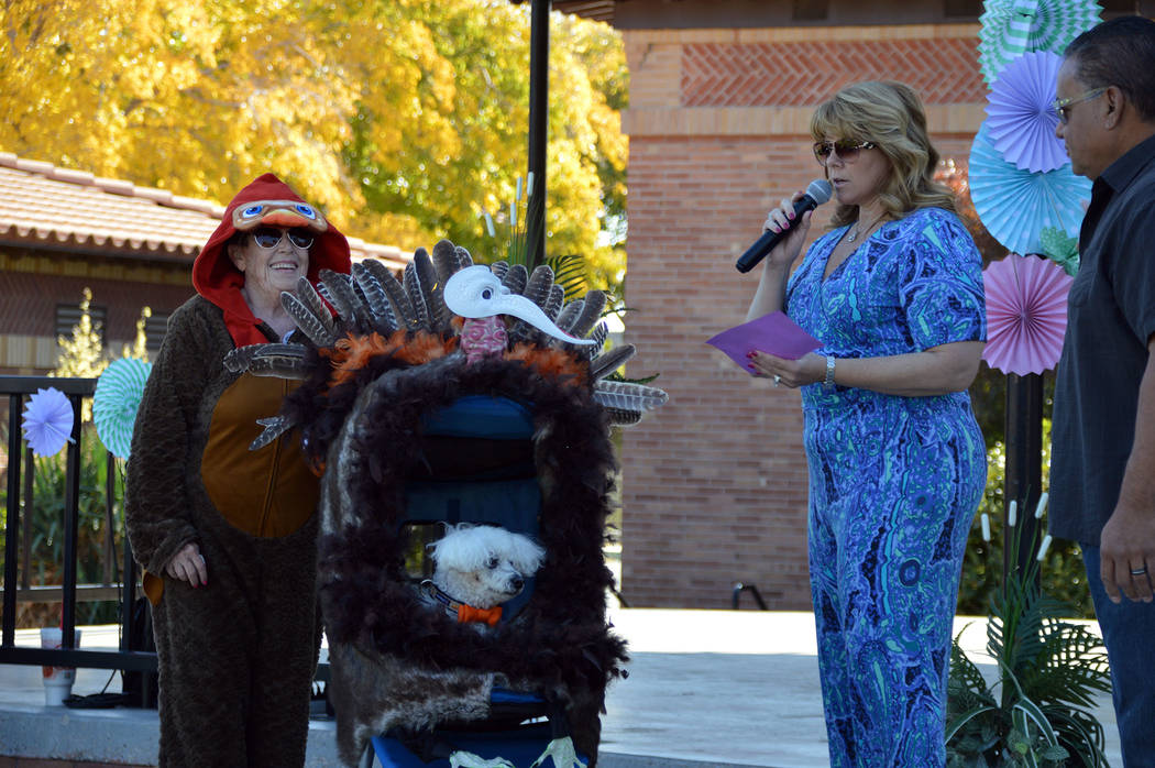 Judith Hoskins, left, answers questions from Jill Rowland-Lagan and Mike Pacini about the costumes she made for her and dog, Rowdy Hoskins, for the Boulder City Chamber of Commerce’s 2019 Pooch Parade on Saturday, Nov. 16, at Bicentennial Park.