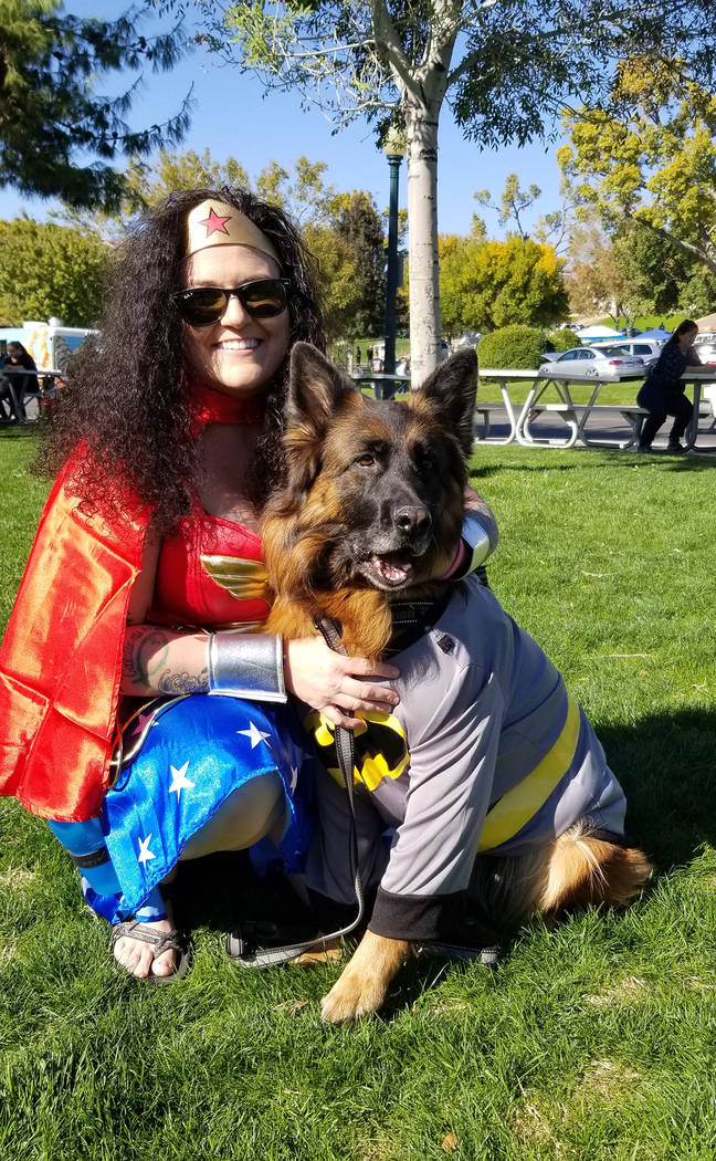 Melinda Goodro, dressed as Wonder Woman, and her dog, Qynn, with a Batman shirt, enjoy time together at the Boulder City Chamber of Commerce’s 2019 Pooch Parade on Saturday, Nov. 16, at Bicentennial Park.