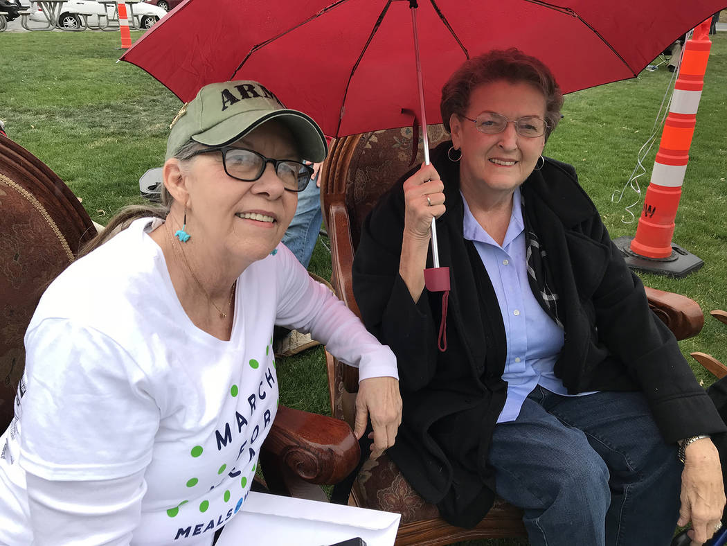 Jennie Smith, left, and Jeanne Thompson, volunteers at the Senior Center of Boulder City, didn’t let a little rain stop them from rocking in rocking chairs to help raise funds for the facility during Saturday’s Rock, Roll &Stroll in Bicentennial Park.