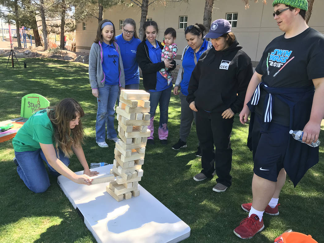 Members of the local 4-H program, from left, Avalon McNary, Maeli McNary, Abbie Peck, Grace Zielinkski holding baby Xochitl Ixmatlahua, Luisa Ixmatlahua, Rahchell Zielinkski and Lane Williams, demonstrate how to play Jenga with giant building blocks in the kids zone at the Rock, Roll &Stroll in Bicentennial Park on Saturday, March 16. The event raised funds for the Senior Center of Boulder City and its Meals on Wheels program.