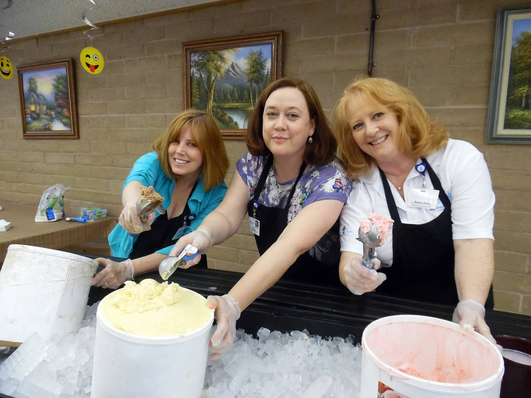 Nathan Adelson volunteers Tricia Delaney-Nevarez, left, and Angela Brommel, center, joined with Marjorie Smith, business development officer for the hospice, as they scooped ice cream during the ice cream social thank you Saturday.
