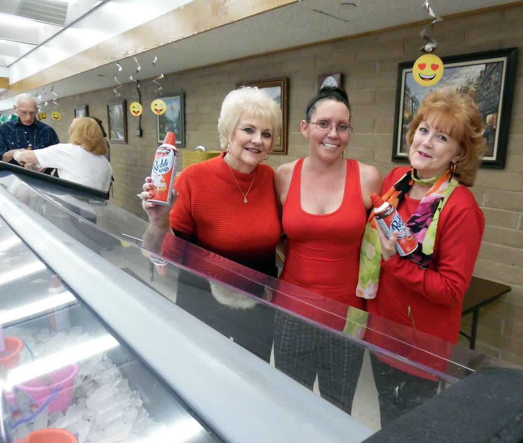 Nathan Adelson volunteers, Tricia Delaney-Nevarez, left, and Angela Brommel, center, joined with Marjorie Smith, business development officer for the hospice, as they scooped up chocolate, vanilla and strawberry ice cream during the ice cream social thank you Saturday at the Senior Center of Boulder City.