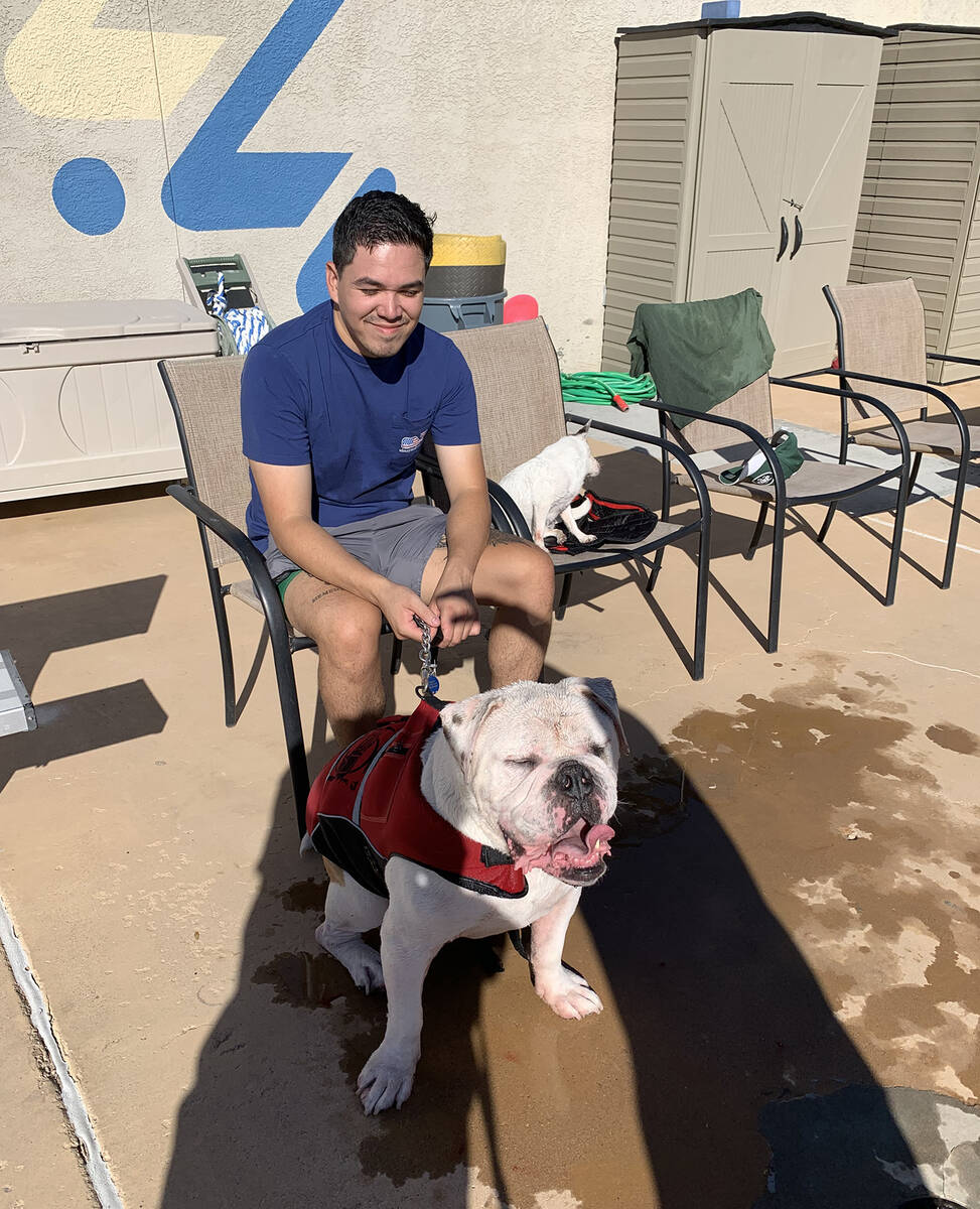 Dallas, an Olde English Bulldogge, takes a break from the activities in the Boulder City Pool during the Soggy Doggy Pool Pawty on Saturday, Sept. 24, with Rafael Fandino, son of Dougie Fandino, who owns Dallas. Sitting in the chair is Princess, a chihuahua.