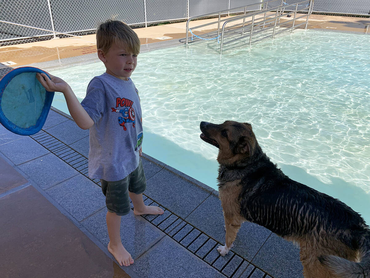 Owen Ozborn, 5, gets ready to throw a water toy into the pool for Charlie, a mixed-breed rescue dog, during the Soggy Doggy Pool Pawty at the Boulder City Pool on Saturday, Sept. 24.