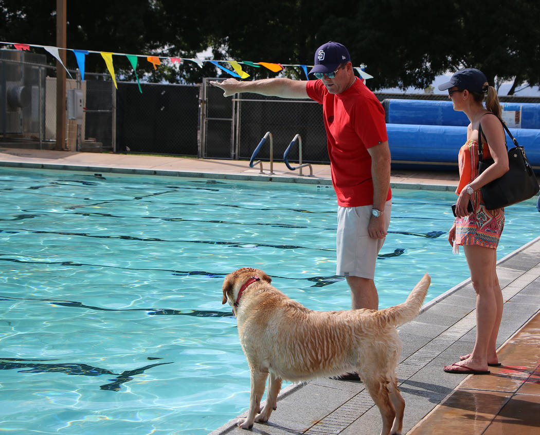 Ed Cave gives his dog Piper some direction about fetching a toy he threw into the pool during Boulder City Pool’s annual Soggy Doggy event on Saturday while Laura Calvert looks on.