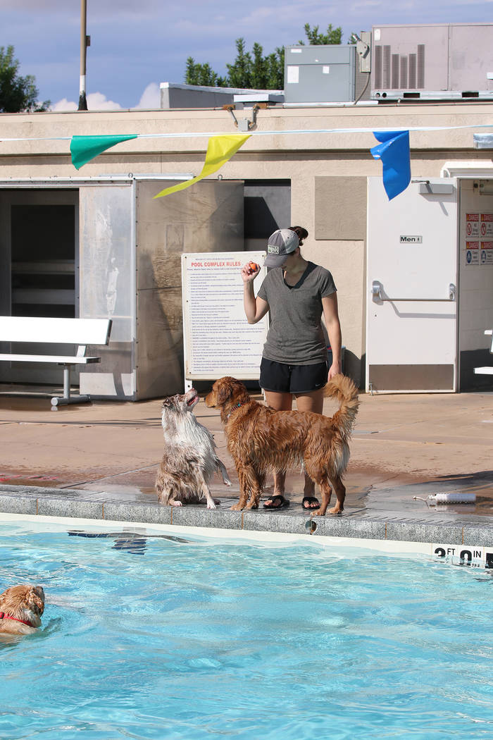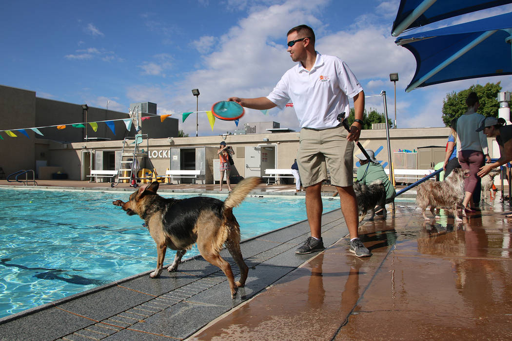 Jake Andersen, aquatic coordinator for the Boulder City Pool, throws a toy into the water for one of the participants at the annual Soggy Doggy event on Saturday.