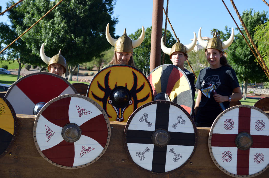 The Sons of Norway Constitution Day celebration at Bicentennial Park on May 17 featured the replica of a Viking ship in which people of all ages enjoyed dressing up, including, from left, Mariah Torgesen, Ella Morris, Spencer Torgesen and Callie Torgesen.