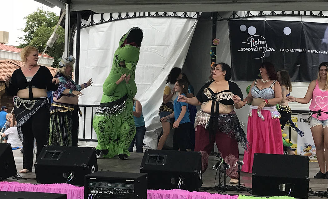 One of the costumed dinosaurs roaming the Spring Jamboree on Sunday to promote the Southern Nevada Gem & Mineral Society’s show joined belly dancers from Henderson.