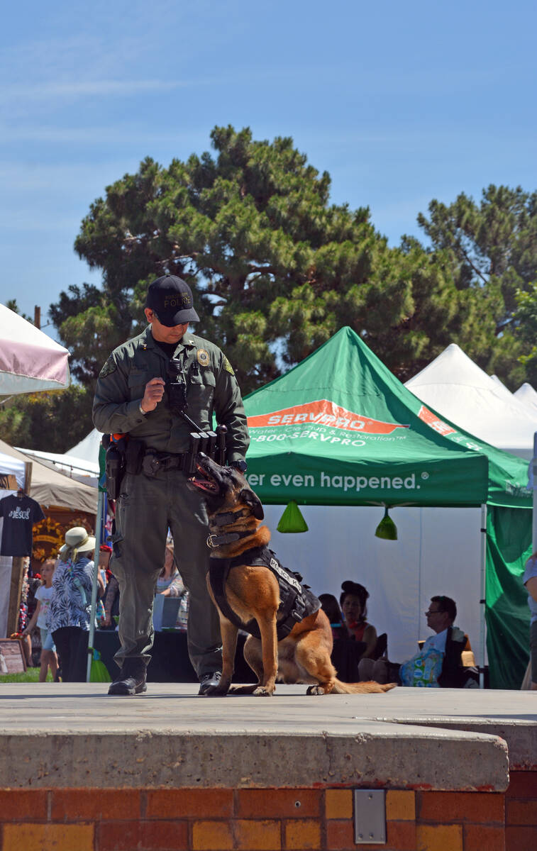 Boulder City Police officer Armando Salazar leads his K-9 partner Lloyd through an exercise at Bark in the Park on Saturday, May 7, at the Spring Jamboree in Boulder City.