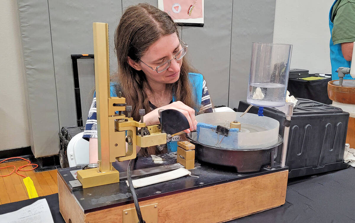 Elaine Fortuna works on faceting a stone at the Southern Nevada Gem and Mineral Society’s booth at the rock and gem show at the Spring Jamboree on Saturday.