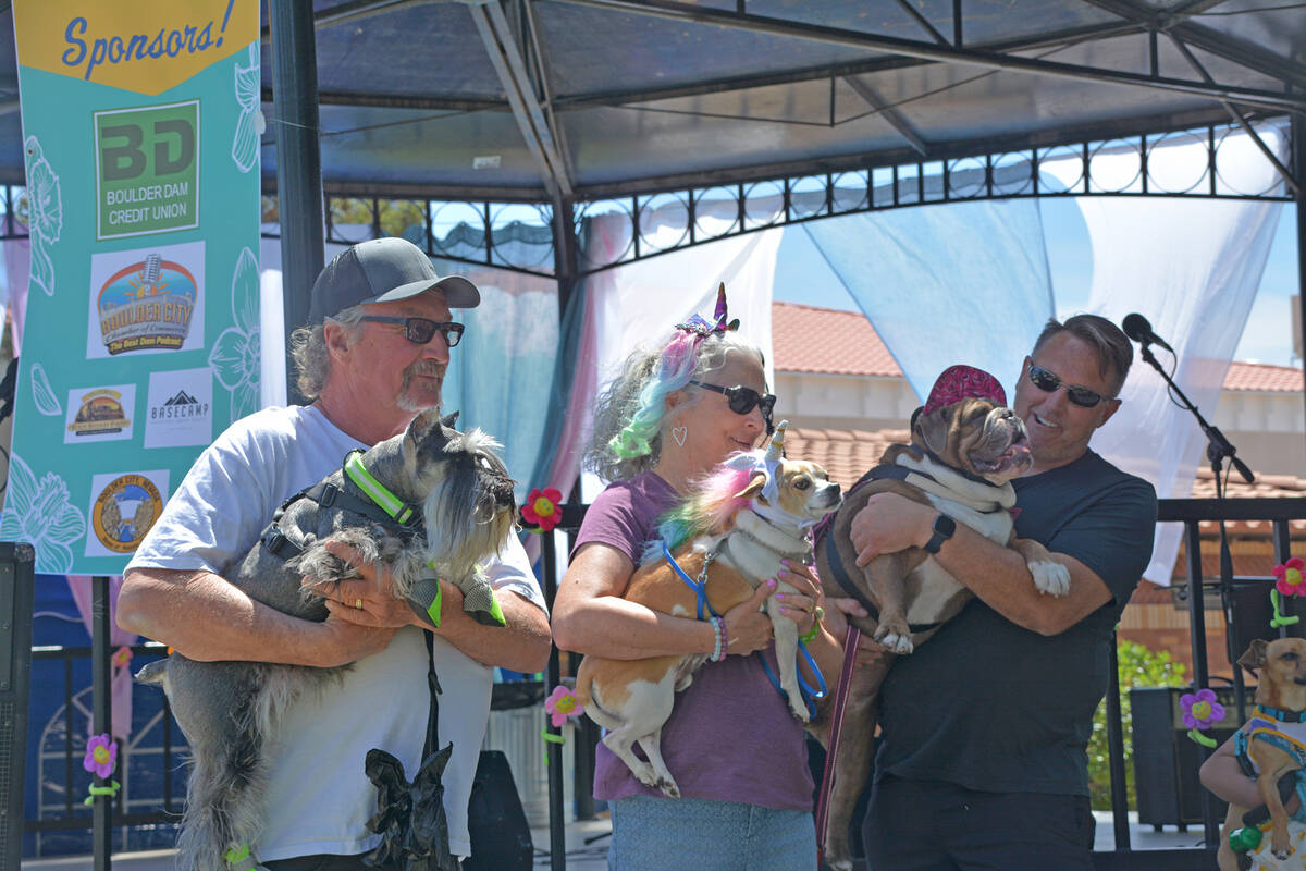 Rod Hosack, left, and his dog Jo Jo participate in the dog and owner look-alike contest at the 2022 Bark in the Park, along with Barbara Pearce and her dog Harry, and Jarrod McClung and his dog Bubbles. Bark in the Park was part of Spring Jamboree, and was held Saturday, May 7, in Boulder City.