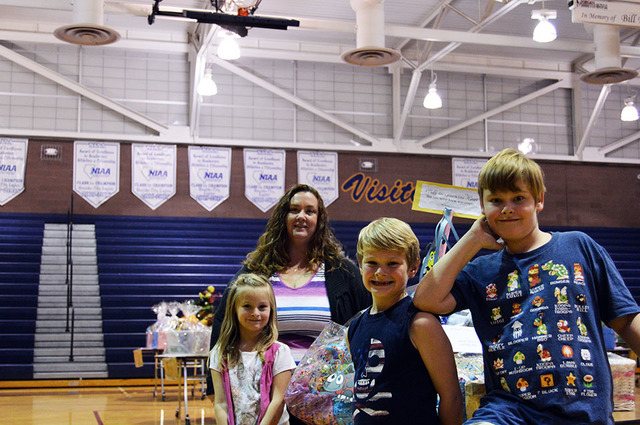 Jamie Carpenter and her children, from left, Julia, Liam and Patrick were all smiles as they looked at baskets of treats at Tricky Tray on Nov. 9 at the Boulder City High School gym.