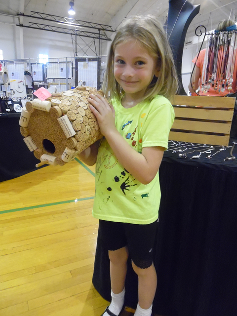 Abigail Brewer, 6, proudly shows off the cork bird house she won Sunday during the Boulder City Art Guild’s 12th annual Winter ArtFest held inside the gym at the Boulder City Parks and Recreation Department.