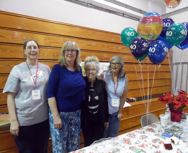 Helping to celebrate Boulder City Art Guild’s 40th anniversary during the group’s 12th annual Winter ArtFest were, from left, Vicki Rose, historian; Nancy Swart, hospitality; Diana Meyer, show coordinator; and Happy Hoekenga.