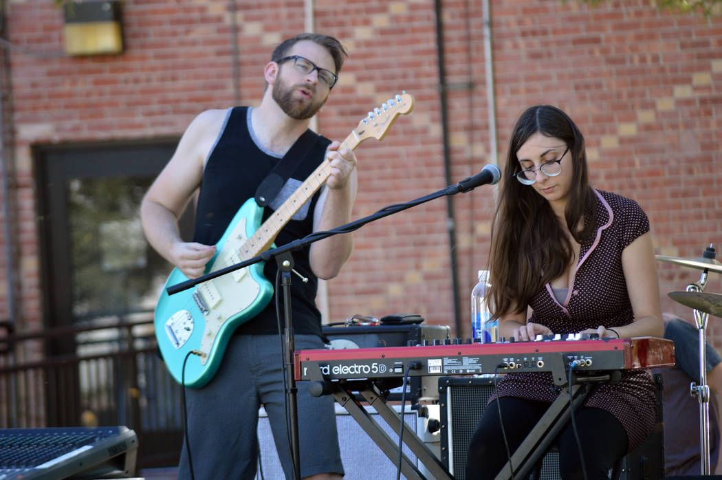 Brian Cantrell of Same Sex Mary plays the guitar while Tsvetelina Stefanova plays the keyboard during the band’s performance at Wurstfest on Saturday.