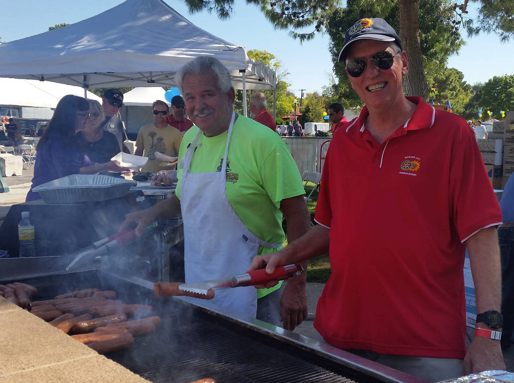 Dale Ryan, left, and Robert Merrell grill bratwursts and beef hot dogs at the 21st annual Wurstfest held Saturday in Bicentennial Park.