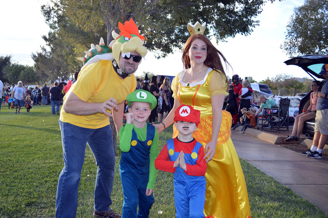 The Hallam family came to the Boulder City Chamber of Commerce’s annual Trunk or Treat on Oct. 13. Amanda Hallam, right, said the boys wanted them all to dress as Mario video game characters, so she was Princess Daisy, Adam, left, was Bowser. Cameron, second from left, was Luigi, and Caden was Mario.