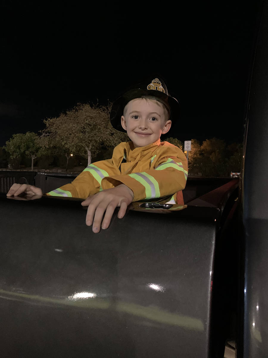 Colston Crosson, 6, came dressed as a fireman at Saturday’s drive-thru Trunk or Treat celebration at Veterans’ Memorial Park.