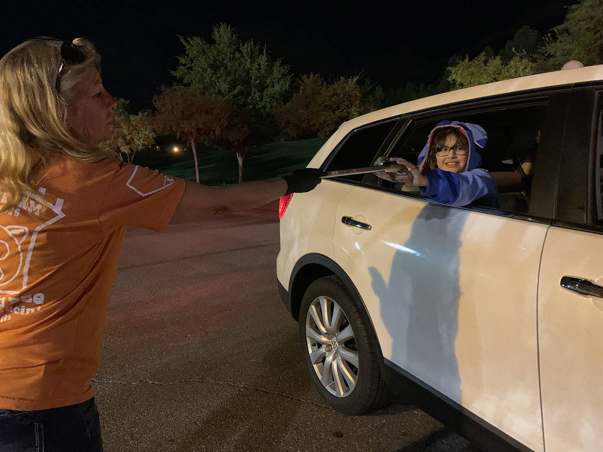 Kelly Fox of Fox Smokehouse BBQ uses long tongs to distribute sweets to Kaylnn Young during Saturday’s, Oct. 24, drive-thru Trunk or Treat celebration at Veterans’ Memorial Park. The holiday event was sponsored by the Boulder City Chamber of Commerce.