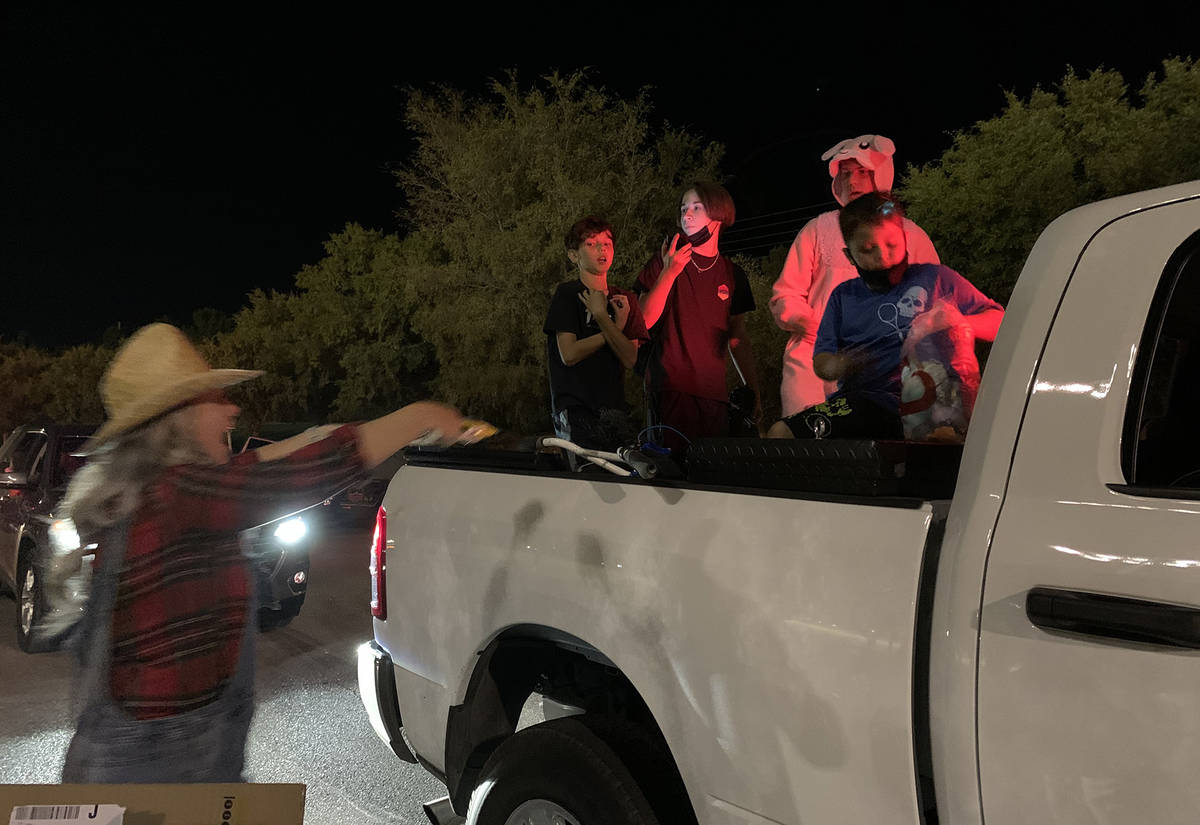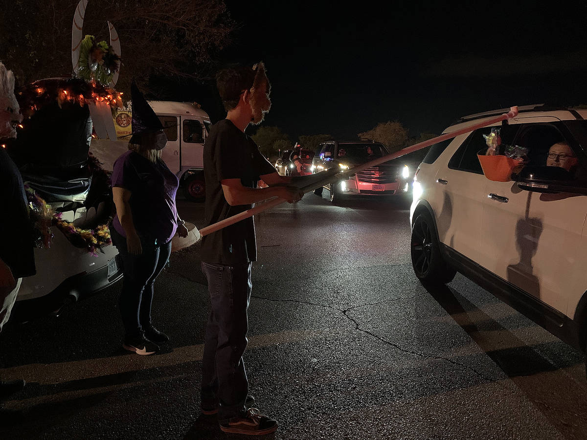 Representing the Southern Nevada State Veterans’ Home during Trunk or Treat on Saturday, Oct. 24, were, from left, Kyle Waggerman, Kristy Waggerman and Jason Waggerman, who used a felt pumpkin bucket attached to a long pole to delivery candy. Boulder City Chamber of Commerce sponsored the drive-thru holiday celebration.