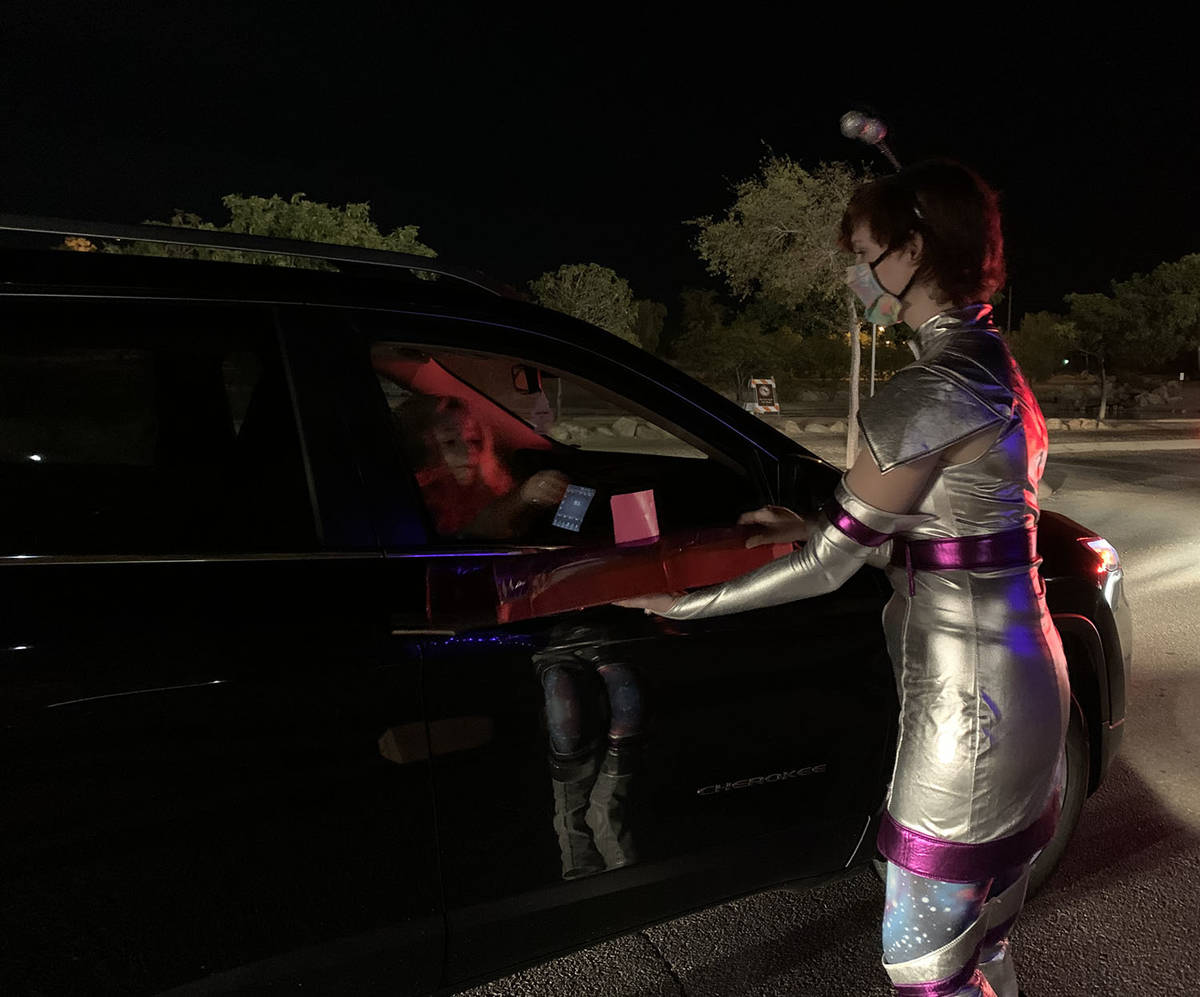 Karli Allison of Serenity Salon and Spa came dressed as popcorn to Saturday’s drive-thru Trunk or Treat celebration at Veterans’ Memorial Park. The holiday event was sponsored by the Boulder City Chamber of Commerce.
