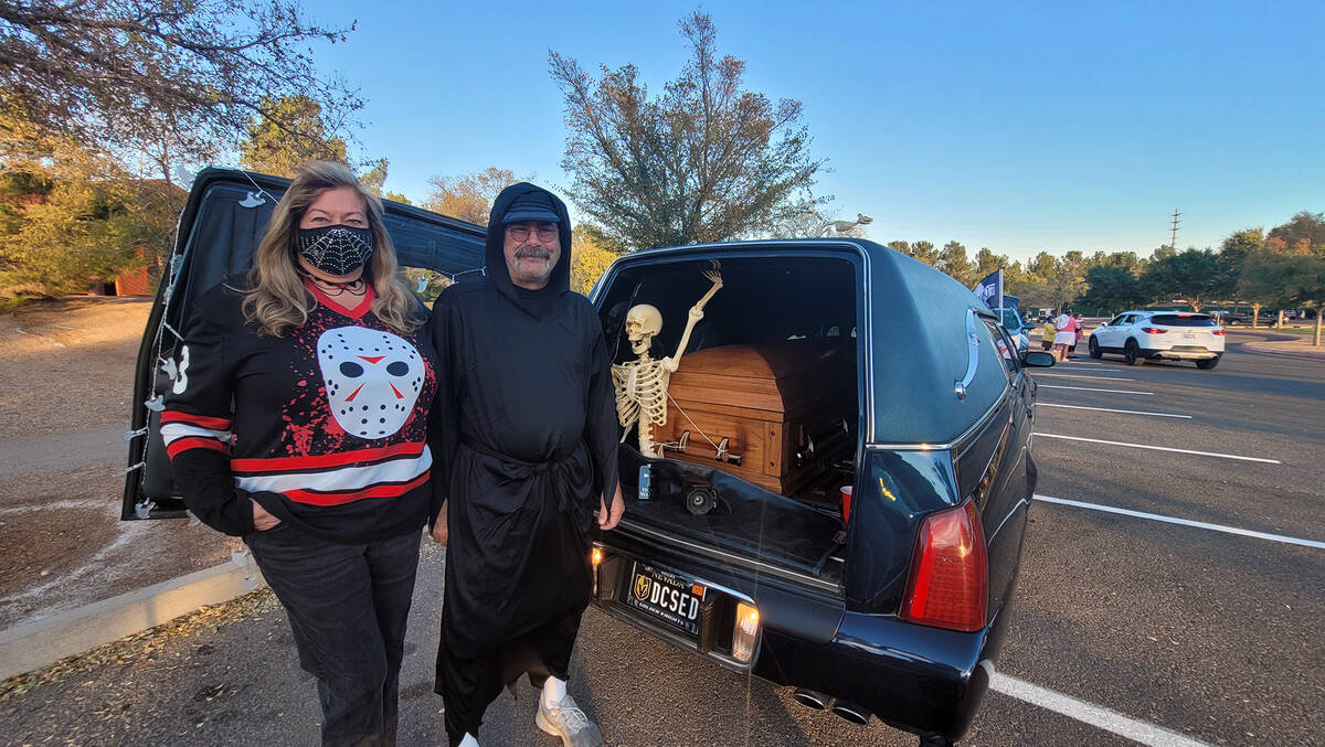 Angela Homme, left, and Joe Pizzuro, representing the Bare Bones Car Club, enjoy their first Trunk or Treat in Boulder City with Emma Homme and Eli Homme.