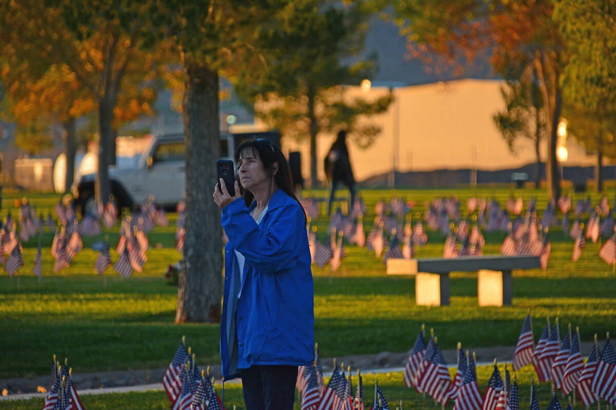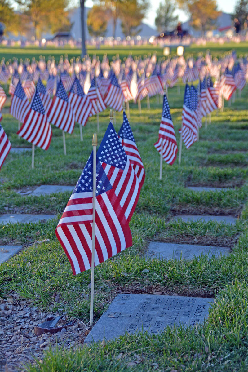 This flag is one of 5,000 placed by Michigan resident Dawn Kramer at the Southern Nevada Veterans Memorial Cemetery in Boulder City to celebrate Veterans Day on Nov. 11. Kramer’s father is buried at the cemetery and she started placing flags there on Veterans Day in 2019 when she visited and noticed there weren’t any.
