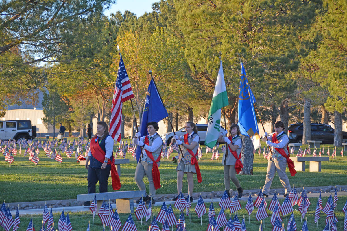 The Girl Scouts of Southern Nevada Honor Guard, from left, honor guard leader Sarah Panariso, Coulter Hampton, Abigail Panariso, Alex Hampton and Reagan Hampton, present the flags at a Nov. 11 Veterans Day ceremony at the Southern Nevada Veterans Memorial Cemetery.