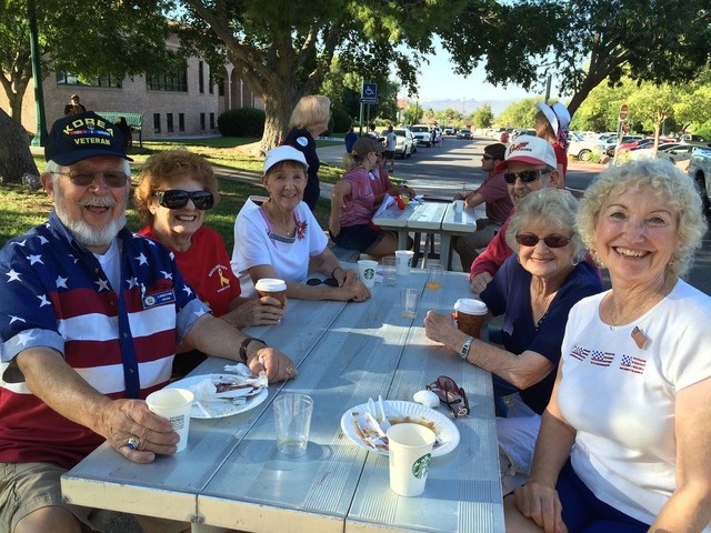 After enjoying the Rotary Club of Boulder City’s pancake breakfast in Bicentennial Park on Monday, July 4, 2016, members of the Sons of Norway await the start of the Damboree parade. Pictured are, from left, LeMoyone Jevne, Mary Moody, Hope Mitchell, Mitch Mitchell, Millie Axe and Vikki Renneckar. Hali Bernstein Saylor/Boulder City Review